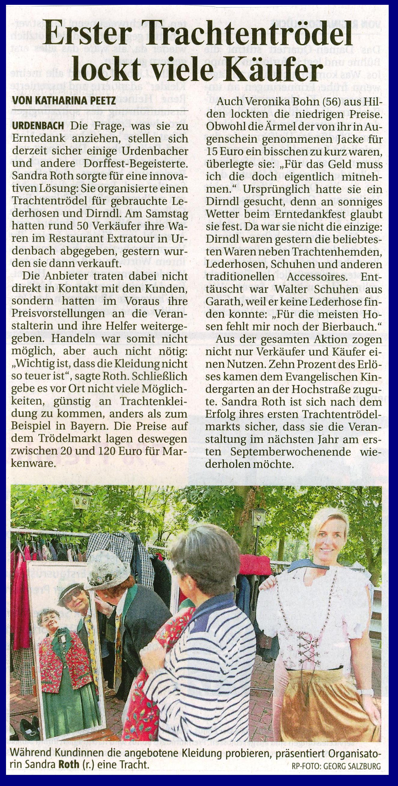 am Samstag, den 08.09. von 10:00 Uhr bis 13:00 Uhr können Lederhosen, Trachtenkleider, Trachtenschuhe, Trachtenhüte, Trachtenmäntel usw. im Extratour Zum Alten Rhein abgegeben werden. Jedes einzelne Teil muss mit Bezeichnung, Größe und Preis ausgezeichnet werden. Bitte machen Sie sich eine Liste von allen Teilen und bringen sie uns eine Kopie mit, auf der wir notieren können welches Teil verkauft ist. Bitte verwenden Sie dafür die PDF Vordrücke. Es werden ausschließlich Teile angenommen, die mit Erntedank/Trachten in Verbindung gebracht werden können.